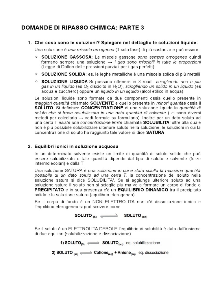 1. Che cosa sono le soluzioni? Spiegare nel dettaglio le soluzioni liquide:
