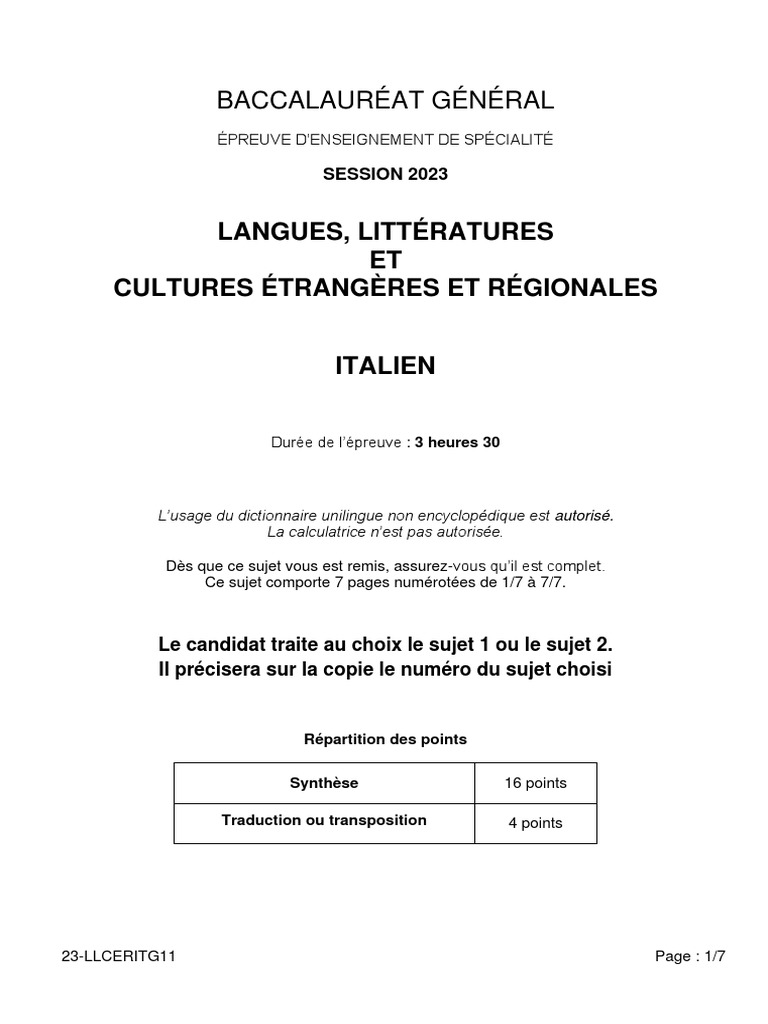 SUJET 2 - THÉMATIQUE : « Laboratorio italiano »
