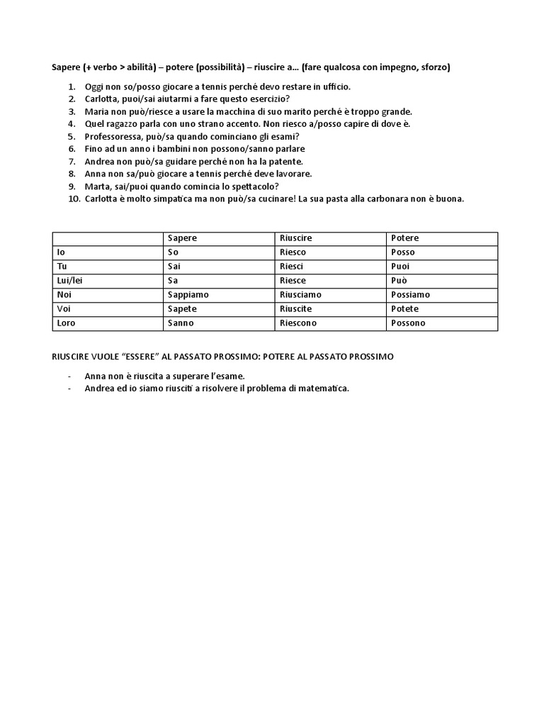 Sapere (+ verbo > abilità) – potere (possibilità) – riuscire a… (fare qualcosa con impegno, sforzo)