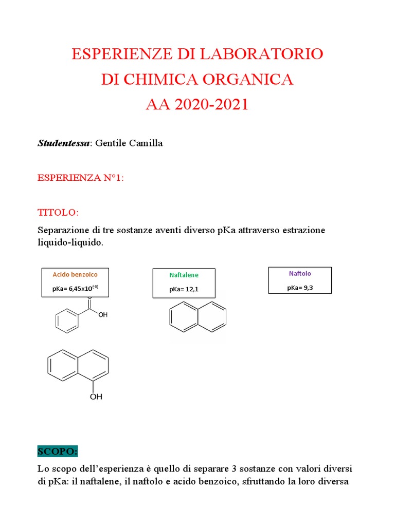 di pKa: il naftalene, il naftolo e acido benzoico, sfruttando la loro diversa