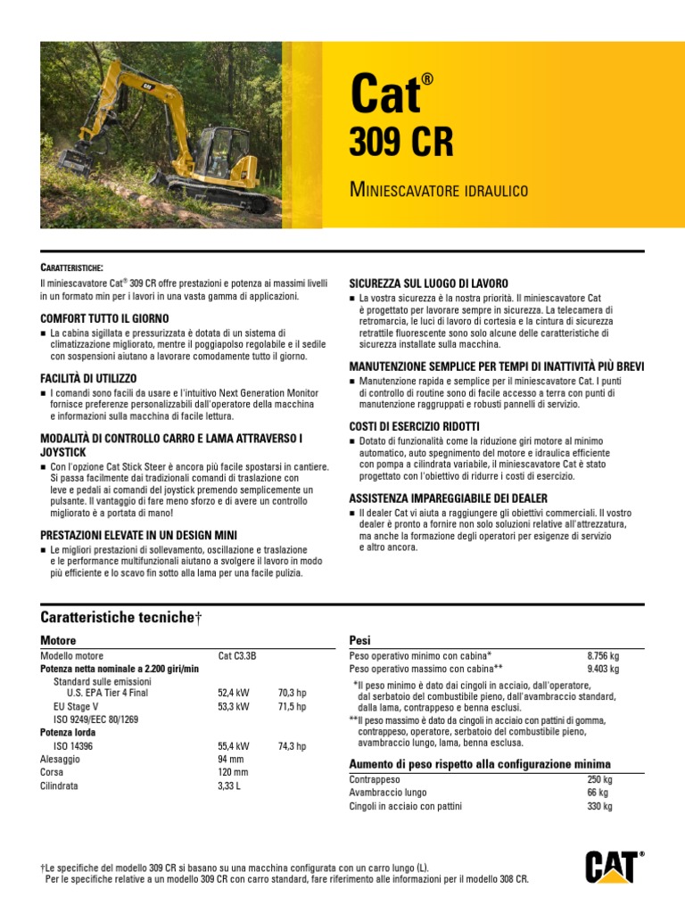Per le specifiche relative a un modello 309 CR con carro standard, fare riferimento alle informazioni per il modello 308 CR.