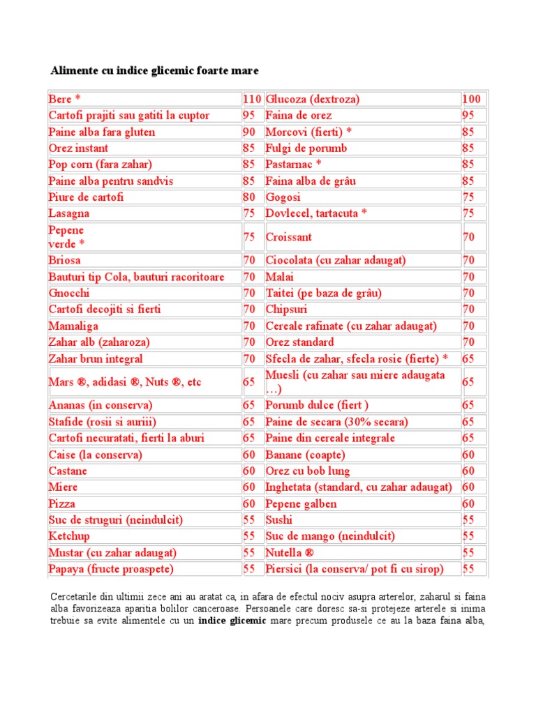 Orez instant Pop corn (fara zahar) Paine alba pentru sandvis Piure de cartofi Lasagna Pepene verde * Briosa Bauturi tip Cola, bauturi racoritoare Gnocchi Cartofi decojiti si fierti Mamaliga Zahar alb (zaharoza) Zahar brun integral Mars , adidasi , Nuts , etc Ananas (in conserva) Stafide (rosii si auriii) Cartofi necuratati, fierti la aburi Caise (la conserva) Castane Miere Pizza Suc de struguri (neindulcit) Ketchup Mustar (cu zahar adaugat) Papaya (fructe proaspete) 110 95 90 85 85 85 80 75 Glucoza (dextroza) Faina de orez Morcovi (fierti) * Fulgi de porumb Pastarnac * Faina alba de gru Gogosi Dovlecel, tartacuta * 100 95 85 85 85 85 75 75 70 70 70 70 70 70 70 65 65 65 65 65 60 60 60 60 55 55 55 55