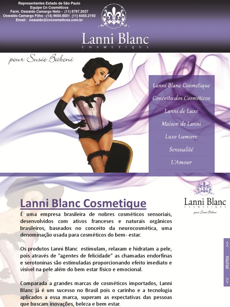 A linha corporal Lanni de Luxe foi desenvolvida com ingredientes nobres, extraindo as melhores propriedades das plantas e leos essenciais para o conforto e a beleza. Os ingredientes so cuidadosamente selecionados. Os extratos de plantas e leos vegetais presentes nessa linha, proporcionam brilho e maciez a pele tratada.