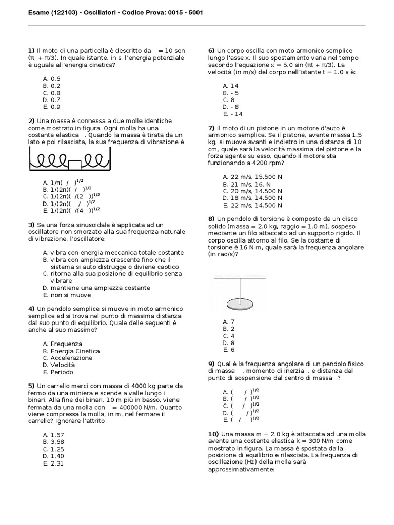 1) Il moto di una particella è descritto da x = 10 sen 6) Un corpo oscilla con moto armonico semplice