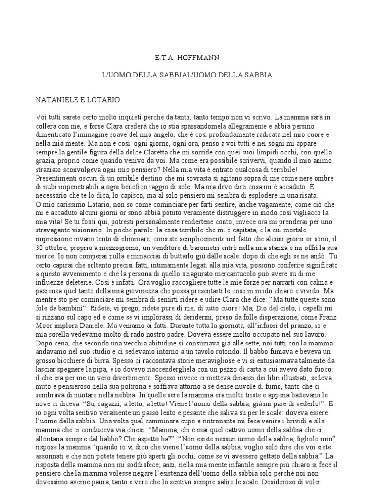 Che cosa ha mai. E tu allora volevi esprimere le immagini interiori con i colori pi accesi e con le ombre e le luci e ti preoccupavi di trovare le parole che ti permettessero almeno di incominciare. E credevi di poter riportare perfettamente subito, sin dalle prime parole, tutto ci che di meraviglioso, di stupendo e di terribile e di allegro e raccapricciante ti fosse accaduto, in modo da colpire tutti come con una scarica elettrica. Ma ogni tua parola, ogni tuo modo di esprimerti, ti appariva incolore e freddo. Tu cerchi, cerchi e balbetti e infine le domande degli amici ti colpiscono come soffi di vento gelato, dentro, nel tuo fervore infocato, sin quasi a spegnerlo. Ma se tu riesci da ardito pittore a tracciare con poche linee temerarie i contorni della tua immagine interiore, allora con poca fatica e con ardore sempre crescente vi stendi i colori, e il vivo tumulto delle molteplici figure trascina gli amici, i quali, come te, si vedono vivi dentro limmagine espressa del tuo spirito. Veramente devo riconoscere, benevolo lettore, che nessuno mi ha chiesto la storia del giovane Nataniele ma tu sai che io appartengo a quella razza di scrittori i quali, quando portano dentro di s qualcosa come quella che ti ho descritto, hanno limpressione che chiunque gli passi vicino, anzi tutto quanto il mondo, debba chiedergli: Che cosa mai ci? Racconta, carissimo. Cos fu pi forte di me parlarti della vita sventurata di Nataniele. Il meraviglioso, lo strano si impossess di tutto il mio animo, ma appunto perch io, o lettore, volevo renderti capace di sopportare il meraviglioso, che non poca cosa, mi sono preoccupato di cominciare la storia di Nataniele in modo significativo, originale, attraente. Cera una volta... in genere questo il miglior inizio, ma freddo. Nella piccola citt di provincia di S. viveva..., un po meglio certo, si entra almeno nellatmosfera. O subito medias in res: Vada al diavolo! esclam con gli occhi ardenti di collera e di terrore lo studente Nataniele quando il mercante di barometri Giuseppe Coppola.... Veramente questo lo avevo gi scritto, quando nello sguardo selvaggio dello studente Nataniele mi parve di vedere qualcosa di buffo, ma la storia non certo allegra. Non mi venne in mente nessuna frase che anche vagamente potesse rispecchiare lo splendore dei colori della mia intima immagine poetica. Decisi perci di non incominciare. Prendi perci, benevolo lettore, le tre lettere che lamico Lotario gentilmente mi fece avere come contorni del quadro che attraverso la mia narrazione far di tutto per colorire. Forse mi riuscir di presentarti, come pu fare un buon pittore, qualche figura che tu troverai somigliante anche se non conosci loriginale, anzi forse ti sembrer di averla gi vista con i tuoi occhi. Forse, caro lettore, allora penserai che non vi nulla di pi meraviglioso e di pi folle della vita reale e che il poeta solo questo pu fare: afferrarla come un pallido riflesso di uno specchio opaco. Affinch si sappia ci che necessario sapere sin da principio, bisogna aggiungere al contenuto di quelle lettere che, poco dopo la morte del padre di Nataniele, Clara e Lotario, figli di un lontano parente, che pure era morto lasciandoli orfani, erano stati accolti in casa dalla mamma di Nataniele. Nataniele e Clara furono legati da una forte, reciproca simpatia e nessuno al mondo aveva certo da dire qualcosa in contrario. Si fidanzarono quando Nataniele lasci la citt per continuare i suoi studi a G. L appunto lo troviamo nella sua ultima lettera, dove frequenta le lezioni del famoso professore di fisica, Spallanzani. Ora potrei senza pi alcuna preoccupazione continuare il mio racconto; ma proprio in questo momento limmagine di Clara mi sta cos viva dinanzi agli occhi da non poterli distogliere da lei, come mi capitava sempre quando mi guardava con quel suo dolce sorriso. Non si poteva dire che Clara fosse bella; questo lo riconoscevano tutti coloro che per professione si intendono di bellezza. Ma gli architetti lodavano le belle proporzioni della sua statura, i pittori trovavano fin troppo caste le forme delle sue spalle, del collo e del busto, ma quasi tutti erano innamorati dei magnifici capelli alla Maddalena e fantasticavano sul colorito degno di Batoni. Uno di loro, un individuo veramente tutto fantasia, paragon in modo veramente originale gli occhi di Clara a un lago di Ruisdael, nel quale si specchia lazzurro limpido di un cielo senza nubi, la ricchezza dei fiori e del boschi, la vita serena della ricca campagna tutta colori. Poeti e pittori andavano oltre e dicevano: Ma che lago, ma che specchi! Possiamo forse guardare questa fanciulla senza che dal suo sguardo si sprigionino canti celesti che penetrano nel profondo del nostro animo cosicch tutto in noi si risveglia e diventa vivo? E se non riusciamo a cantare nulla di veramente bello, segno che dentro di noi non c veramente nulla e questo lo possiamo leggere chiaramente nellironico sorriso che fluttua sulle labbra di Clara quando tentiamo di cinguettarle