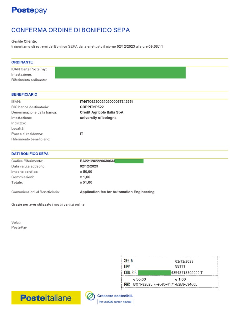 Comunicazioni al Beneficiario: Application fee for Automation Engineering