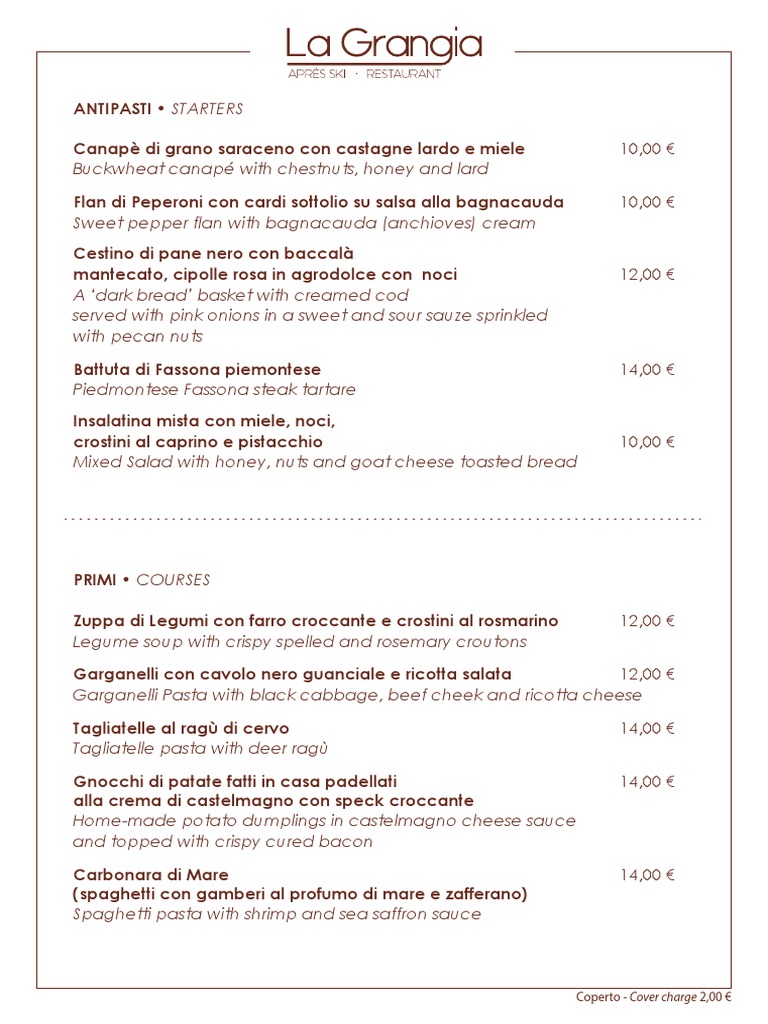 Coperto - Cover charge 2,00 €