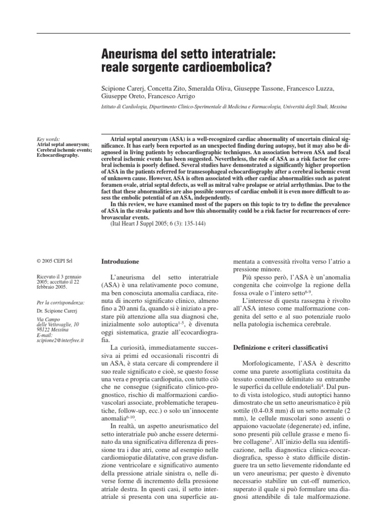 French Study Group on Patent Foramen Ovale and Atrial Septal Aneurysm. Am Heart J 1995; 130: 1083-8. Mugge A, Daniel WG, Angermann C, et al. Atrial septal aneurysm in adult patients: a multicenter study using transthoracic and transesophageal echocardiography. Circulation 1995; 19: 2785-92. Meissner I, Whisnant JP, Khandheria BK, et al. Prevalence of potential risk factors for stroke assessed by transesophageal echocardiography and carotid ultrasonography: the SPARC study. Stroke Prevention: Assessment of Risk in a Community. Mayo Clin Proc 1999; 74: 862-9. Mendel T, Pasierski T, Szwed H, Baranska-Gieruszcak M, Czlonkowska A. Transesophageal echocardiographic findings in patients with anterior and posterior circulation infarcts. Acta Neurol Scand 1998; 97: 63-7. Cabanes L, Coste J, Derumeaux G, et al. Interobserver and intraobserver variability in detection of patent foramen ovale and atrial septal aneurysm with transesophageal echocardiography. J Am Soc Echocardiogr 2002; 15: 441-6. Zabalgoitia-Reyes M, Herrera C, Ghandi DK, Mehlman DJ, McPherson DD, Talano JV. A possible mechanism for neurologic ischemic events in patients with atrial septal aneurysm. Am J Cardiol 1990; 66: 761-4. Marazanof M, Roudaut R, Cohen A, et al. Atrial septal aneurysm: morphologic characteristics in a large population: pathological associations. A French multicenter study on 259 patients investigated by transesophageal echocardiography. Int J Cardiol 1995; 52: 59-65. Mattioli AV, Aquilina M, Oldani A, Longhini C, Mattioli G. Atrial septal aneurysms as a cardioembolic source in adult patients with stroke and normal carotid arteries. A multicenter study. Eur Heart J 2001; 22: 261-8. Klotzsch C, Sliwka U, Berlit P. An increased frequency of patent foramen ovale in patients with transient global amnesia. Analysis of 53 consecutive patients. Arch Neurol 1996; 53: 504-8. Kristensen BO, Malm J, Carlberg BO, et al. Epidemiology and etiology of ischemic stroke in young adults aged 18 to 44 years in Northen Sweden. Stroke 1997; 28: 1702-9. Sacco RL, Ellenberg JH, Mohr JP, et al. Infarcts of undetermined cause: the NINCDS Stroke Data Bank. Ann Neurol 1989; 25: 382-90. Lucas C, Goullard L, Marchau M Jr, et al. Higher prevalence of atrial septal aneurysms in patients with ischemic stroke of unknown cause. Acta Neurol Scand 1994; 89: 210-3. Mattioli AV, Bonetti L, Aquilina M, et al. The association between atrial septal aneurysm and mitral valve prolapse in patients with recent stroke and normal carotid arteries. Ital Heart J 2003; 4: 602-6. Serafini O, Misuraca G, Greco F, Bisignani G, Manes MT, Venneri N. Prevalenza di anomalie del setto interatriale e loro associazione con recenti episodi di stroke/attacco ischemico transitorio: valutazione ecocardiografica in 18 631 pazienti. Ital Heart J Suppl 2003; 4: 39-45. Cerrato P, Imperiale D, Priano L, et al. Transesophageal echocardiography in patients without arterial and major cardiac sources of embolism: difference between stroke subtypes. Cerebrovasc Dis 2002; 13: 174-83. Cerrato P, Grasso M, Imperiale D, et al. Stroke in young patients: etiopathogenesis and risk factors in different age classes. Cerebrovasc Dis 2004; 18: 154-9. Cereda M, Trocino G. Lecocardiografia nei pazienti con sindromi cerebrovascolari acute. Razionale allutilizzo ed impatto clinico. Ital Heart J Suppl 2002; 3: 26-35. Belkin RN, Hurwitz BJ, Kisslo J. Atrial septal aneurysm: association with cerebrovascular and peripheral embolic events. Stroke 1987; 18: 856-62.