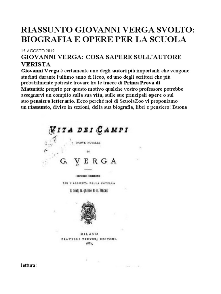 RIASSUNTO GIOVANNI VERGA SVOLTO:
