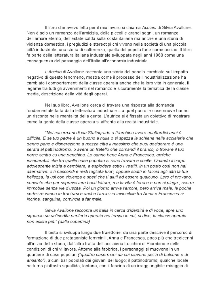 Il libro che avevo letto per il mio lavoro si chiama Acciaio di Silvia Avallone.