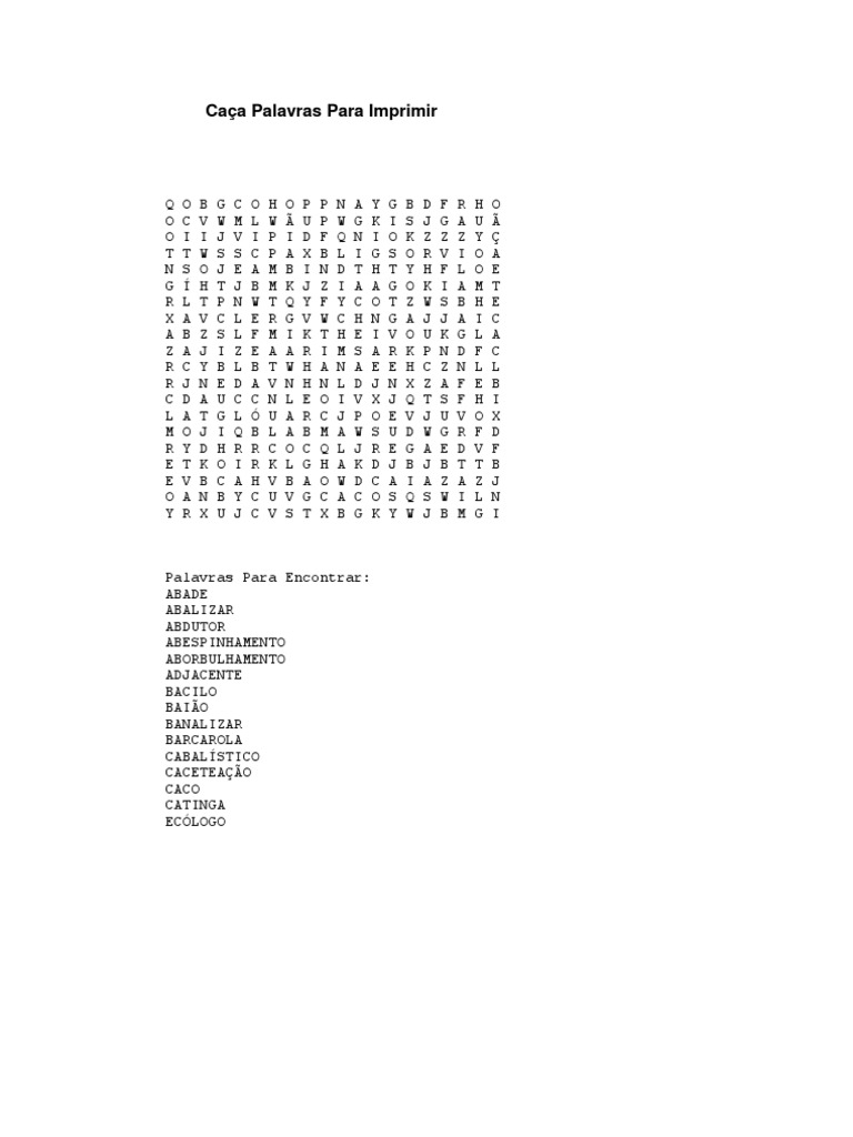 Palavras Para Encontrar: ABADE ABALIZAR ABDUTOR ABESPINHAMENTO ABORBULHAMENTO ADJACENTE BACILO BAIO BANALIZAR BARCAROLA CABALSTICO CACETEAO CACO CATINGA ECLOGO