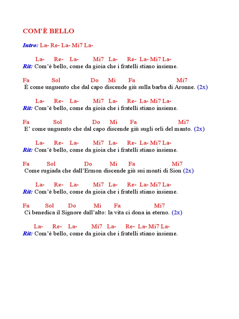 Rit: Com’è bello, come da gioia che i fratelli stiano insieme.