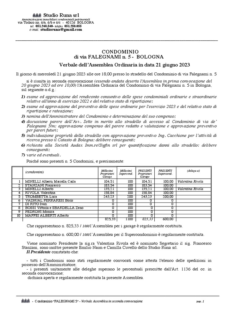 20 giugno 2023 ad ore 10,00) l'Assemblea Ordinaria del Condominio di via Falegnami n. 5 in Bologna,