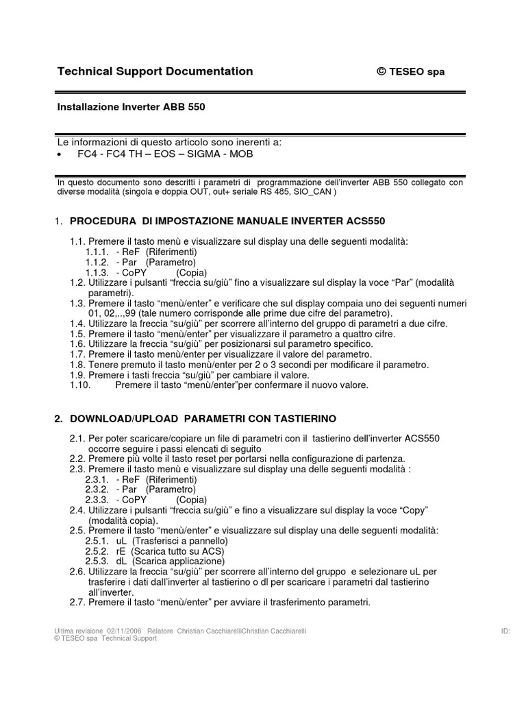 In questo documento sono descritti i parametri di programmazione dell’inverter ABB 550 collegato con