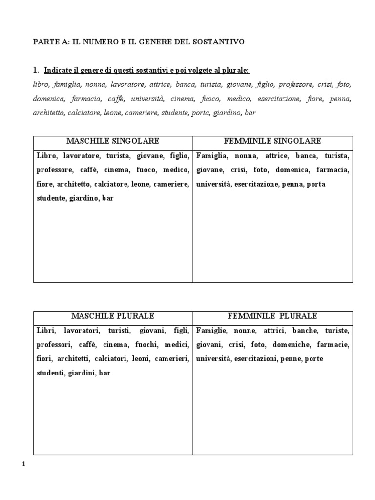1. Indicate il genere di questi sostantivi e poi volgete al plurale: