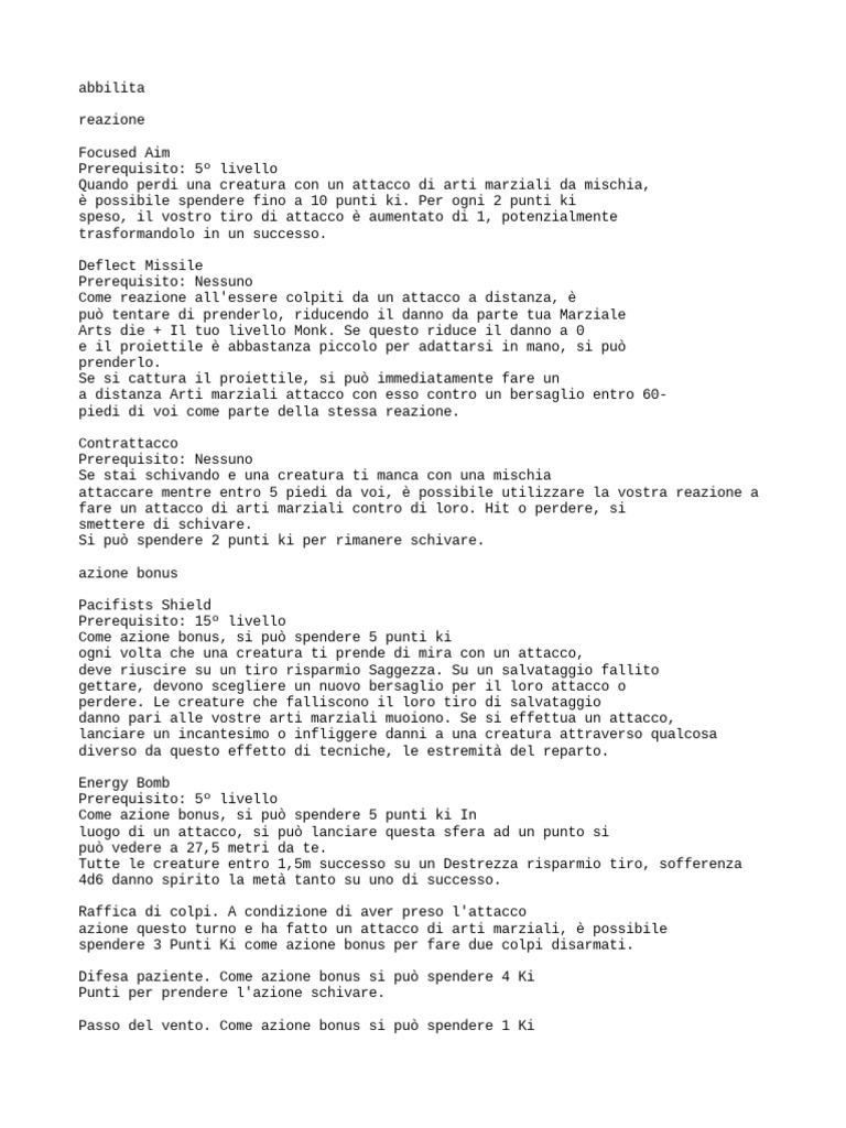 (Fare riferimento alla colonna di arti marziali della tabella di classe monaco a