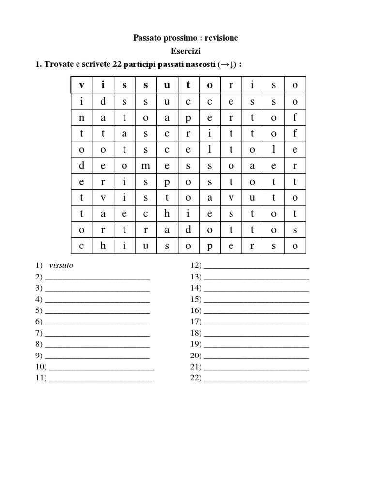 1. Trovate e scrivete 22 participi passati nascosti (→↓) :