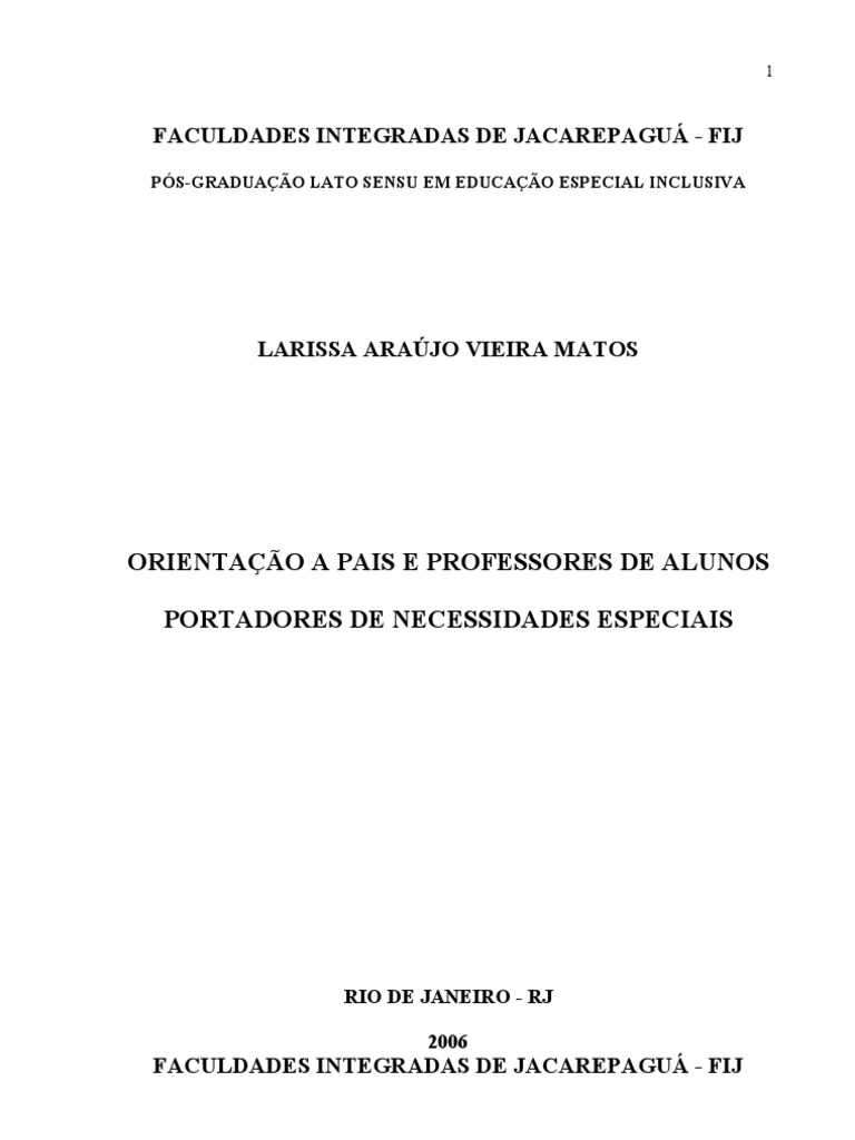 Monografia apresentada s Faculdades Integradas de Jacarepagu - FIJ como parte dos requisitos para a Concluso do Curso de Ps-Graduao Lato Sensu em Educao Especial Inclusiva.