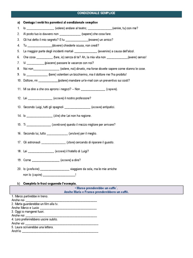 a) Coniuga i verbi tra parentesi al condizionale semplice