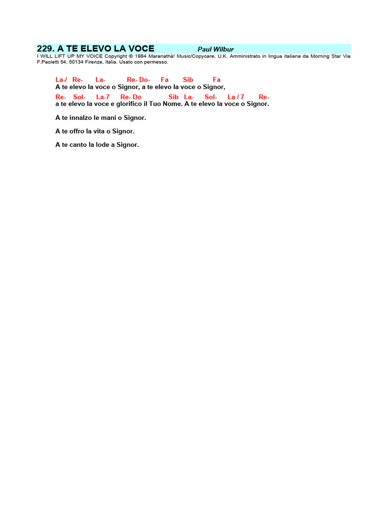 a te elevo Ia voce e glorifico il Tuo Nome. A te elevo Ia voce o Signor.