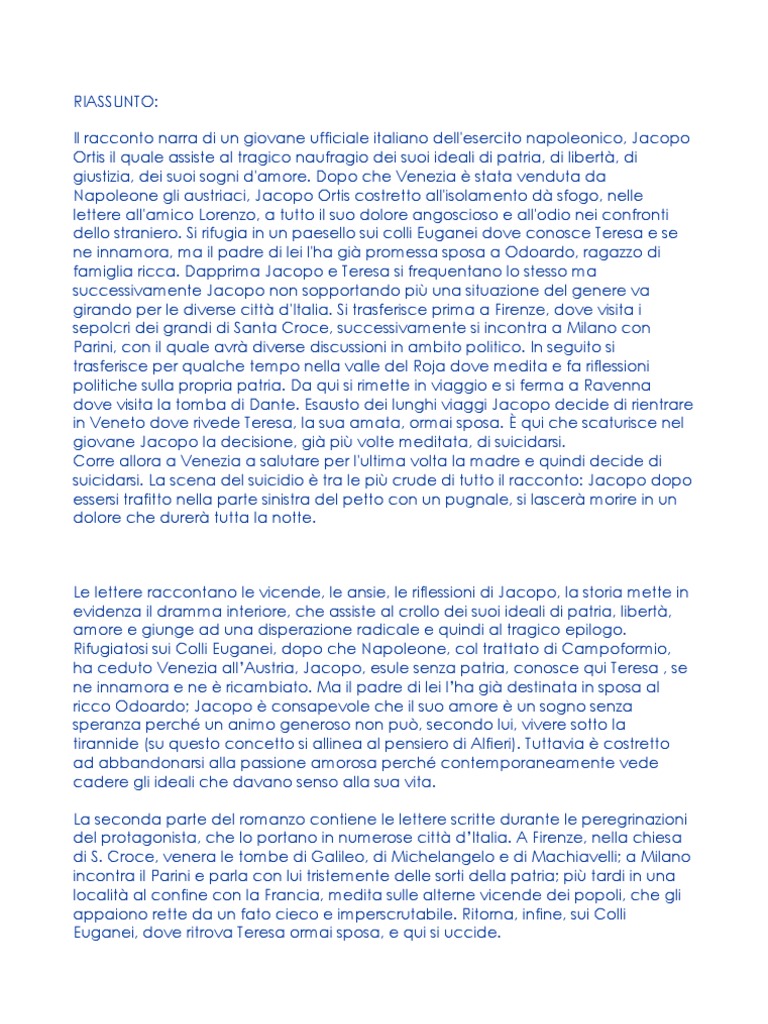 suoi ideali di patria, di libert, di giustizia, dei suoi sogni d'amore. Dopo che Venezia stata venduta da Napoleone gli austriaci, Jacopo Ortis costretto all'isolamento d sfogo, nelle lettere all'amico Lorenzo, a tutto il suo dolore angoscioso e all'odio nei confronti dello straniero. Si rifugia in un paesello sui colli Euganei dove conosce Teresa e se ne innamora, ma il padre di lei l'ha gi promessa sposa a Odoardo, ragazzo di famiglia ricca. Dapprima Jacopo e Teresa si frequentano lo stesso ma successivamente Jacopo non sopportando pi una situazione del genere va girando per le diverse citt d'Italia. Si trasferisce prima a Firenze, dove visita i sepolcri dei grandi di Santa Croce, successivamente si incontra a Milano con Parini, con il quale avr diverse discussioni in ambito politico. In seguito si trasferisce per qualche tempo nella valle del Roja dove medita e fa riflessioni politiche sulla propria patria. Da qui si rimette in viaggio e si ferma a Ravenna dove visita la tomba di Dante. Esausto dei lunghi viaggi Jacopo decide di rientrare in Veneto dove rivede Teresa, la sua amata, ormai sposa. qui che scaturisce nel giovane Jacopo la decisione, gi pi volte meditata, di suicidarsi. Corre allora a Venezia a salutare per l'ultima volta la madre e quindi decide di suicidarsi. La scena del suicidio tra le pi crude di tutto il racconto: Jacopo dopo essersi trafitto nella parte sinistra del petto con un pugnale, si lascer morire in un dolore che durer tutta la notte.