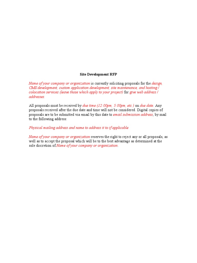custom application development, site maintenance, and hosting / colocation services (leave those which apply to your project) for give web address / addresses. All proposals must be received by due time (12:00pm, 5:00pm, etc.) on due date. Any proposals received after the due date and time will not be considered. Digital copies of proposals are to be submitted via email by this date to email submission address, by mail to the following address: Physical mailing address and name to address it to if applicable Name of your company or organization reserves the right to reject any or all proposals, as well as to accept the proposal which will be to the best advantage as determined at the sole discretion of Name of your company or organization.