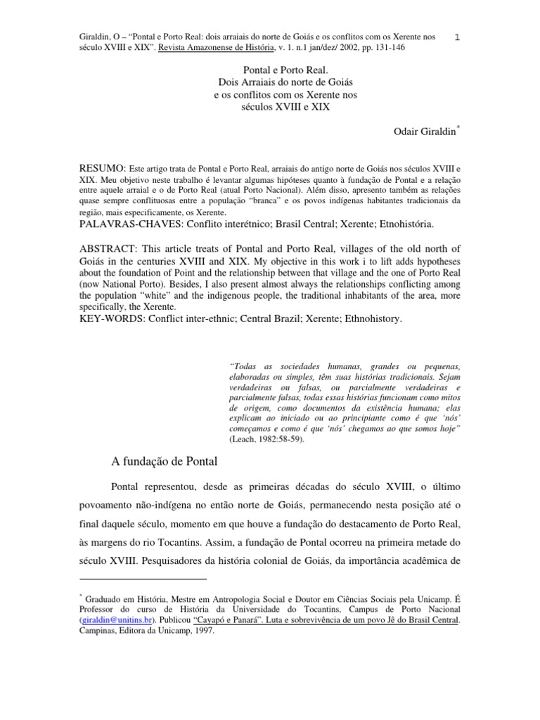 Giraldin, O Pontal e Porto Real: dois arraiais do norte de Gois e os conflitos com os Xerente nos sculo XVIII e XIX. Revista Amazonense de Histria, v. 1. n.1 jan/dez/ 2002, pp. 131-146