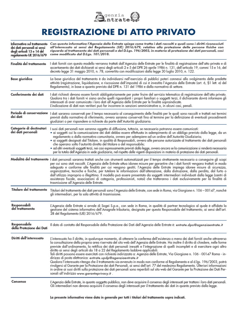 Finalità del trattamento I dati forniti con questo modello verranno trattati dall’Agenzia delle Entrate per le finalità di registrazione dell’atto privato e di