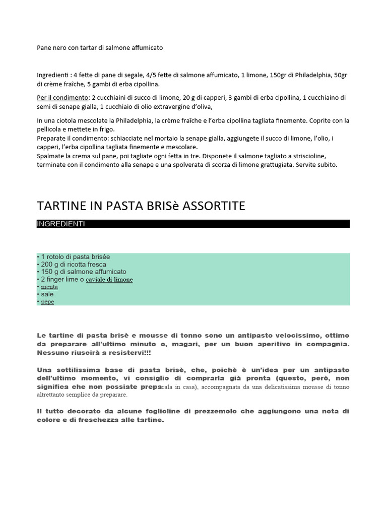 maionese, con yogurt) della mousse di salmone, del tonno, delle olive.