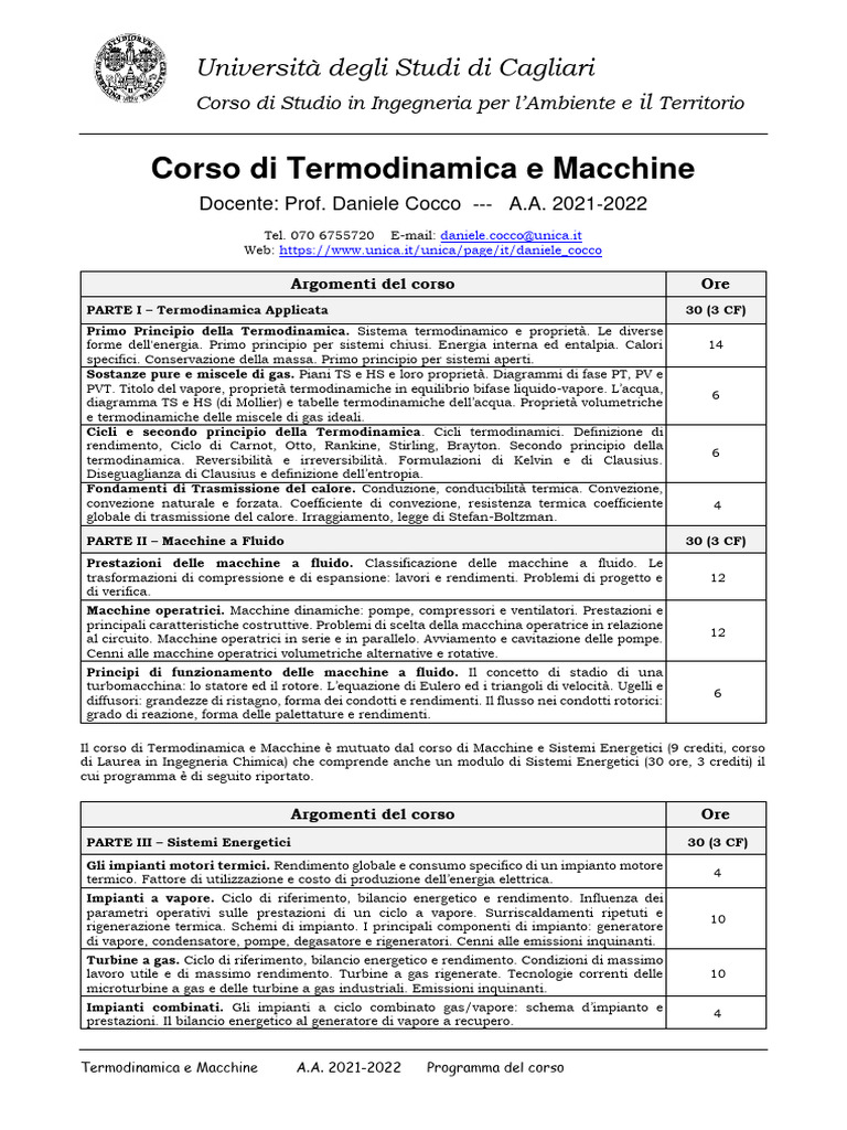 Il corso di Termodinamica e Macchine è mutuato dal corso di Macchine e Sistemi Energetici (9 crediti, corso
