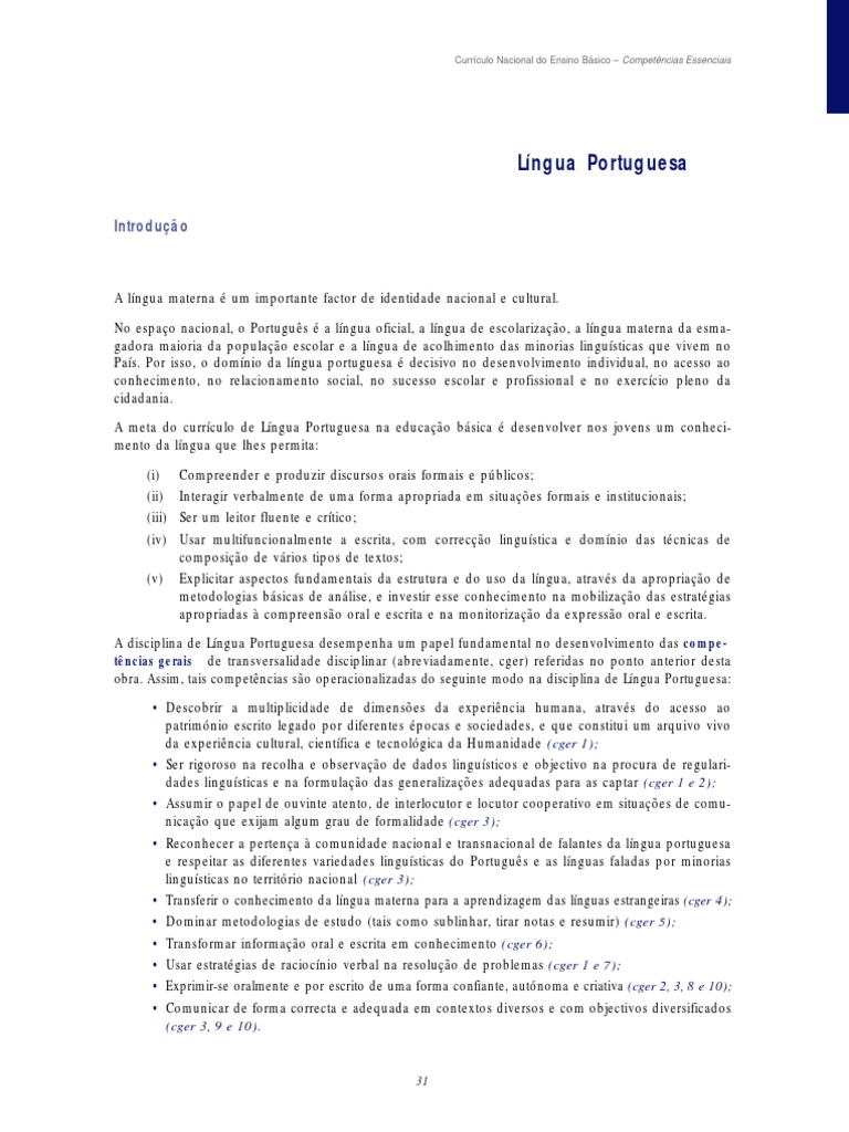 tências gerais de transversalidade disciplinar (abreviadamente, cger) referidas no ponto anterior desta obra. Assim, tais competências são operacionalizadas do seguinte modo na disciplina de Língua Portuguesa: