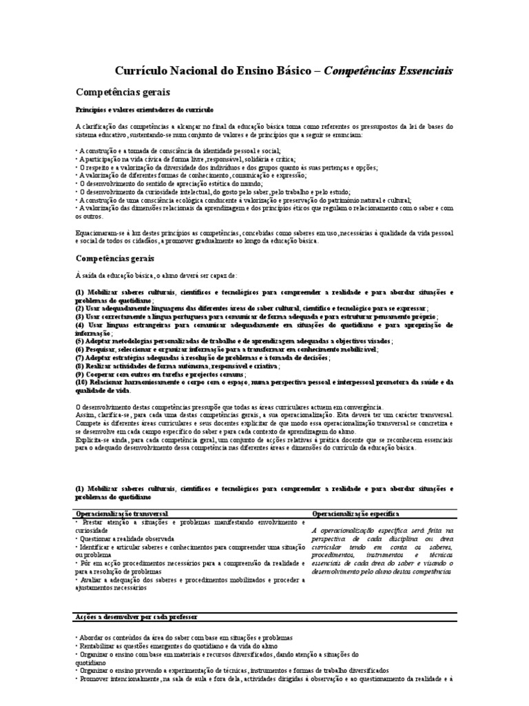 Explicita-se ainda, para cada competência geral, um conjunto de acções relativas à prática docente que se reconhecem essenciais