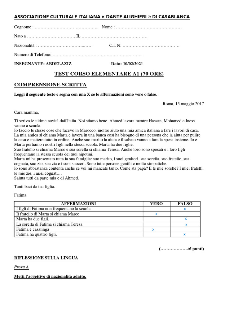 TEST CORSO ELEMENTARE A1 (70 ORE)