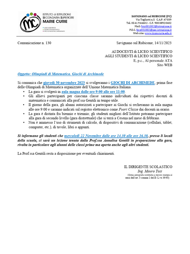 Si comunica che giovedì 30 novembre 2023 si svolgeranno i GIOCHI DI ARCHIMEDE, prima fase