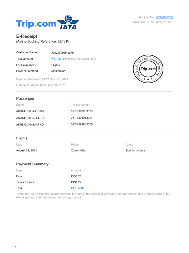 Total amount €1,164.48 (taxes & fees included)