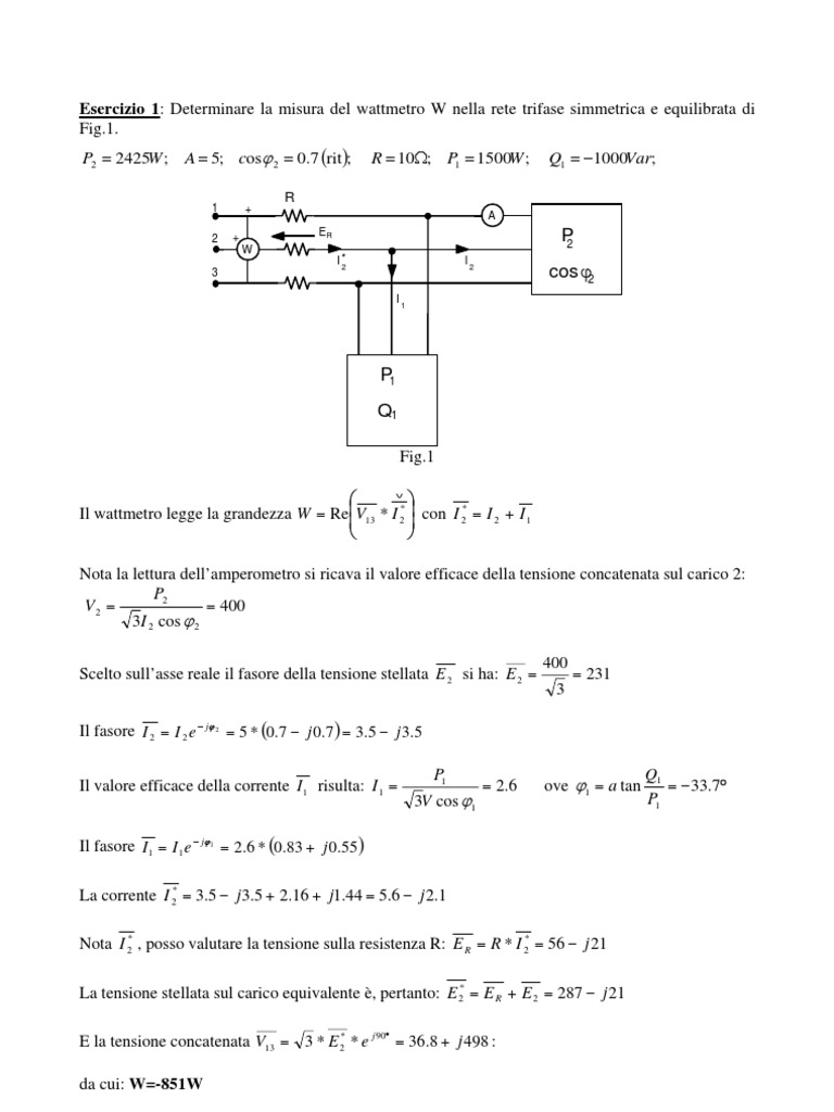 Esercizio 1: Determinare la misura del wattmetro W nella rete trifase simmetrica e equilibrata di Fig.1.