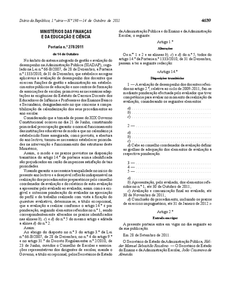 A presente portaria entra em vigor no dia seguinte ao da sua publicao. Em 28 de Setembro de 2011. O Secretrio de Estado da Administrao Pblica, Hlder Manuel Sebastio Rosalino. O Secretrio de Estado do Ensino e da Administrao Escolar, Joo Casanova de Almeida.