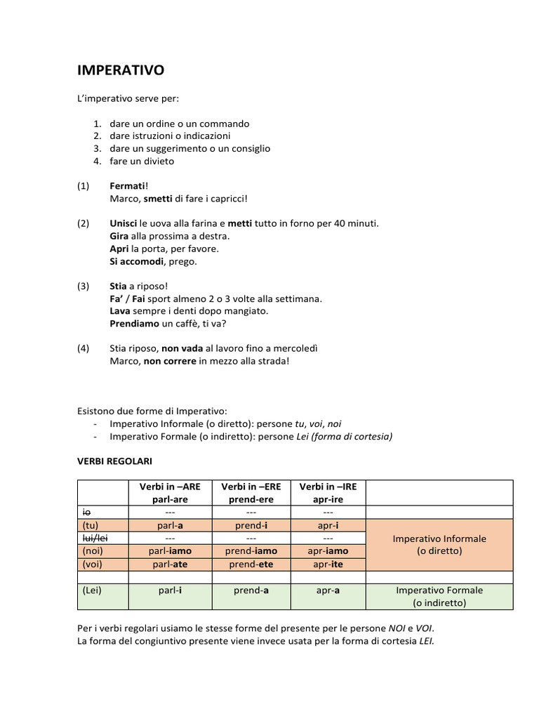 - Imperativo Informale (o diretto): persone tu, voi, noi