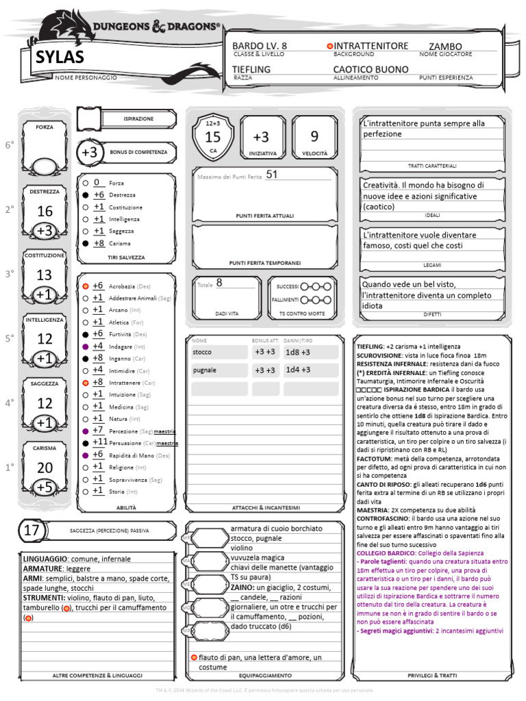 ARMI: semplici, balstre a mano, spade corte, TS su paura) caratteristica o un tiro per i danni, il bardo può