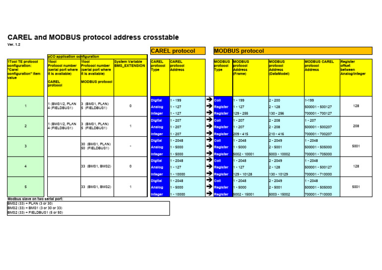 CAREL and MODBUS protocol address crosstable