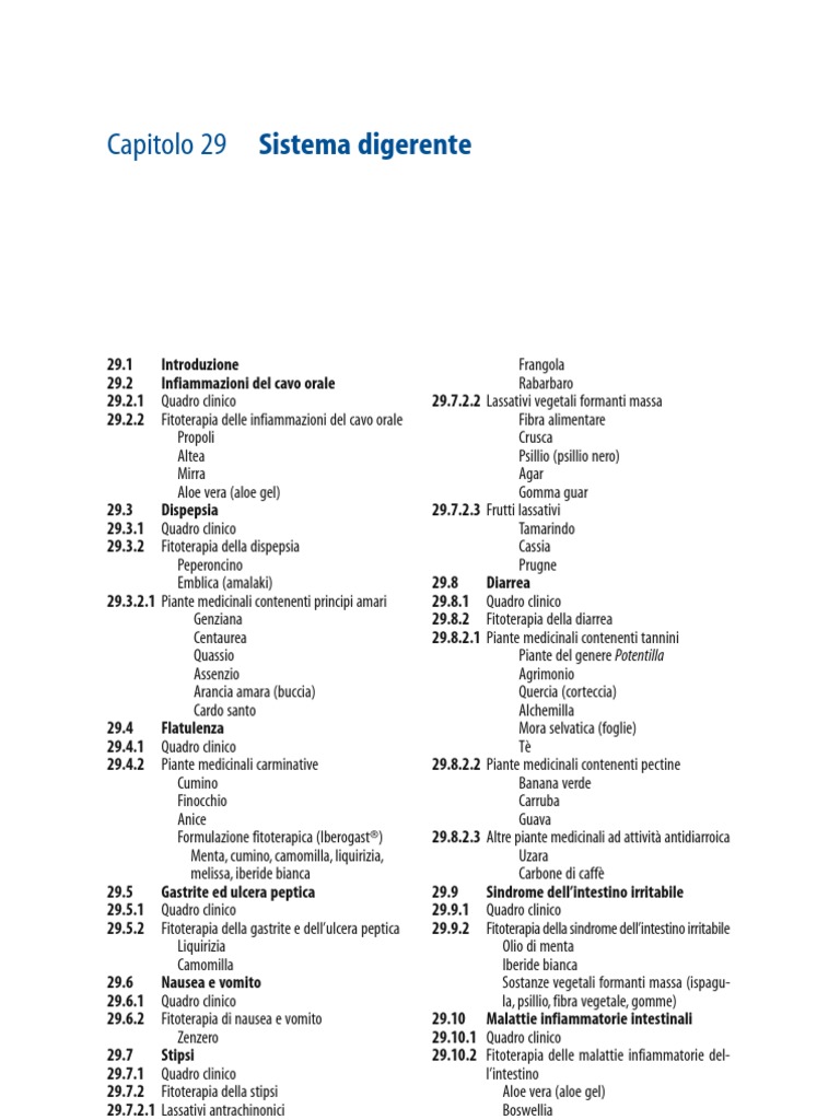 Frangola Rabarbaro [Link] Lassativi vegetali formanti massa Fibra alimentare Crusca Psillio (psillio nero) Agar Gomma guar [Link] Frutti lassativi Tamarindo Cassia Prugne 29.8 Diarrea 29.8.1 Quadro clinico 29.8.2 Fitoterapia della diarrea [Link] Piante medicinali contenenti tannini Piante del genere Potentilla Agrimonio Quercia (corteccia) Alchemilla Mora selvatica (foglie) T [Link] Piante medicinali contenenti pectine Banana verde Carruba Guava [Link] Altre piante medicinali ad attivit antidiarroica Uzara Carbone di caff 29.9 Sindrome dellintestino irritabile 29.9.1 Quadro clinico 29.9.2 Fitoterapia della sindrome dellintestino irritabile Olio di menta Iberide bianca Sostanze vegetali formanti massa (ispagula, psillio, fibra vegetale, gomme) 29.10 Malattie infiammatorie intestinali 29.10.1 Quadro clinico 29.10.2 Fitoterapia delle malattie infiammatorie dellintestino Aloe vera (aloe gel) Boswellia Psillio biondo Letture di approfondimento