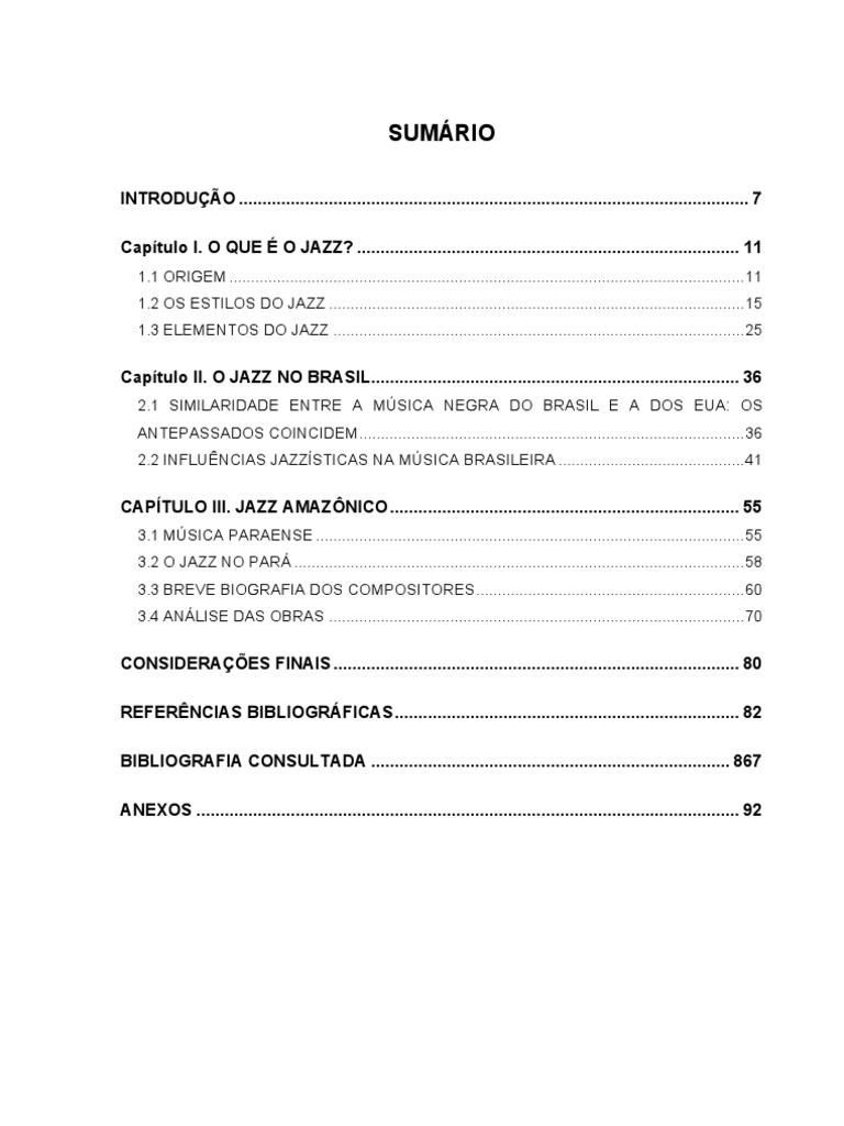 http://www.ejazz.com.br/detalhes-estilos.asp?cd=181. Acesso em: 10 out. 2006. BRANDO, Pramo. A Vida e a Arte Musical de Tynnko Costa. 1999. [S.N]. Trabalho de Concluso de Curso de Graduao em Educao Artstica, ahbilitao em Msica da Universidade do Estado do Par, Belm, 2003. BRITO, Brasil Rocha. Bossa Nova. In: CAMPOS, Augusto de. Balano da Bossa e outras Bossas. So Paulo: SP. Perspectiva, 1978. CALADO, Carlos. 1956 O Jazz Como Espetculo. So Paulo: SP. Perspectiva: Secretaria de Estado da Cultura, 1990. CATARSE. Disponvel em: http://pt.wikipedia.org/wiki/Catarse. Acesso em: 5 out. 2006. CONDUR, Marise Teles. Produo Cientfica na Universidade: Normas Para Apresentao. Belm: Eduepa, 2004. COSTA, Tynnko. Ritmos Amaznicos (Partituras para Orquestras Big Band). Belm: CEJUP, 2000.