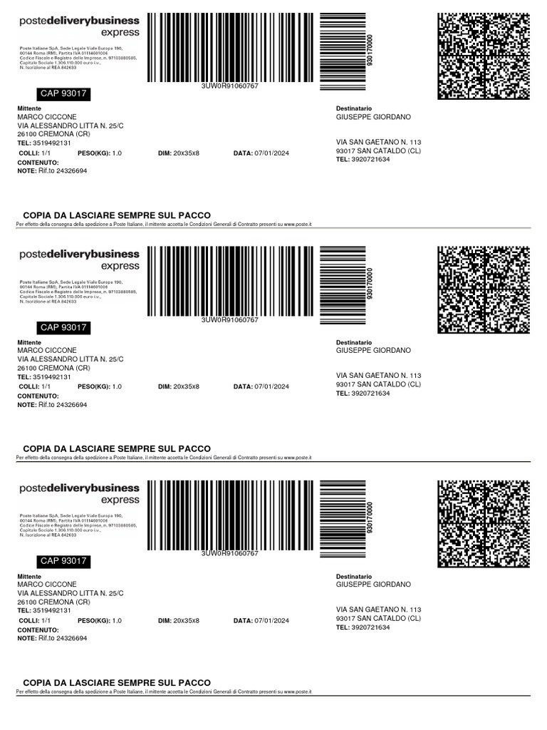 Per effetto della consegna della spedizione a Poste Italiane, il mittente accetta le Condizioni Generali di Contratto presenti su [Link]