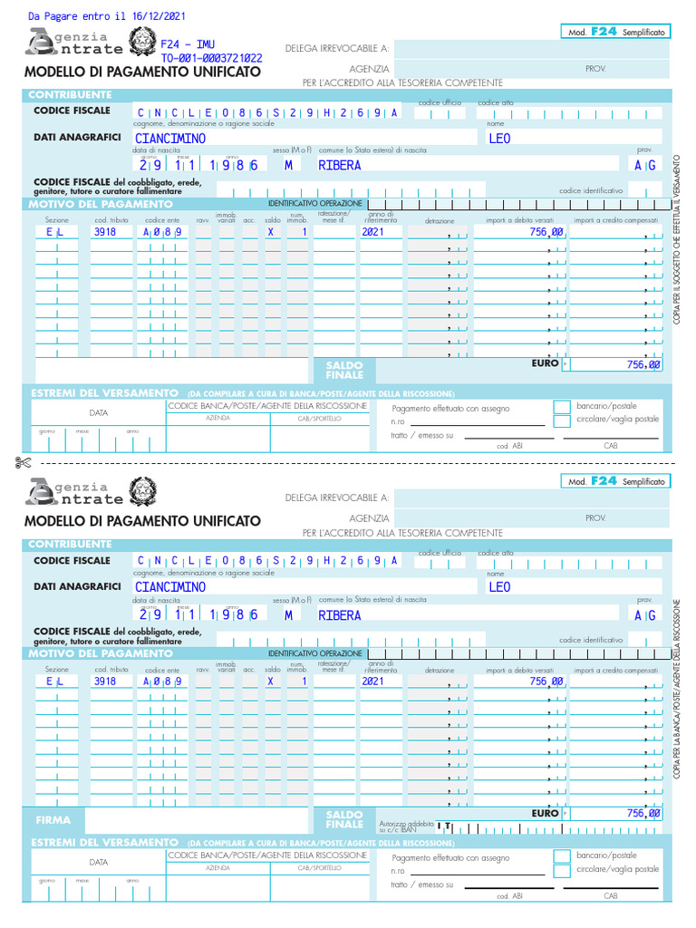 COPIA PER LA BANCA/POSTE/AGENTE DELLA RISCOSSIONE