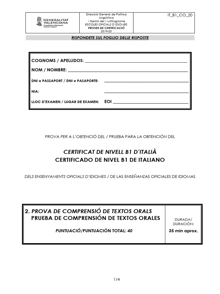 CERTIFICAT DE NIVELL B1 D’ITALIÀ