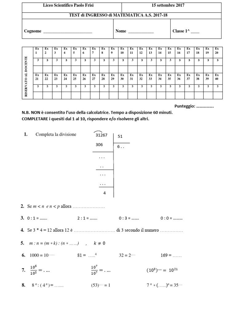 TEST di INGRESSO di MATEMATICA A.S. 2017-18