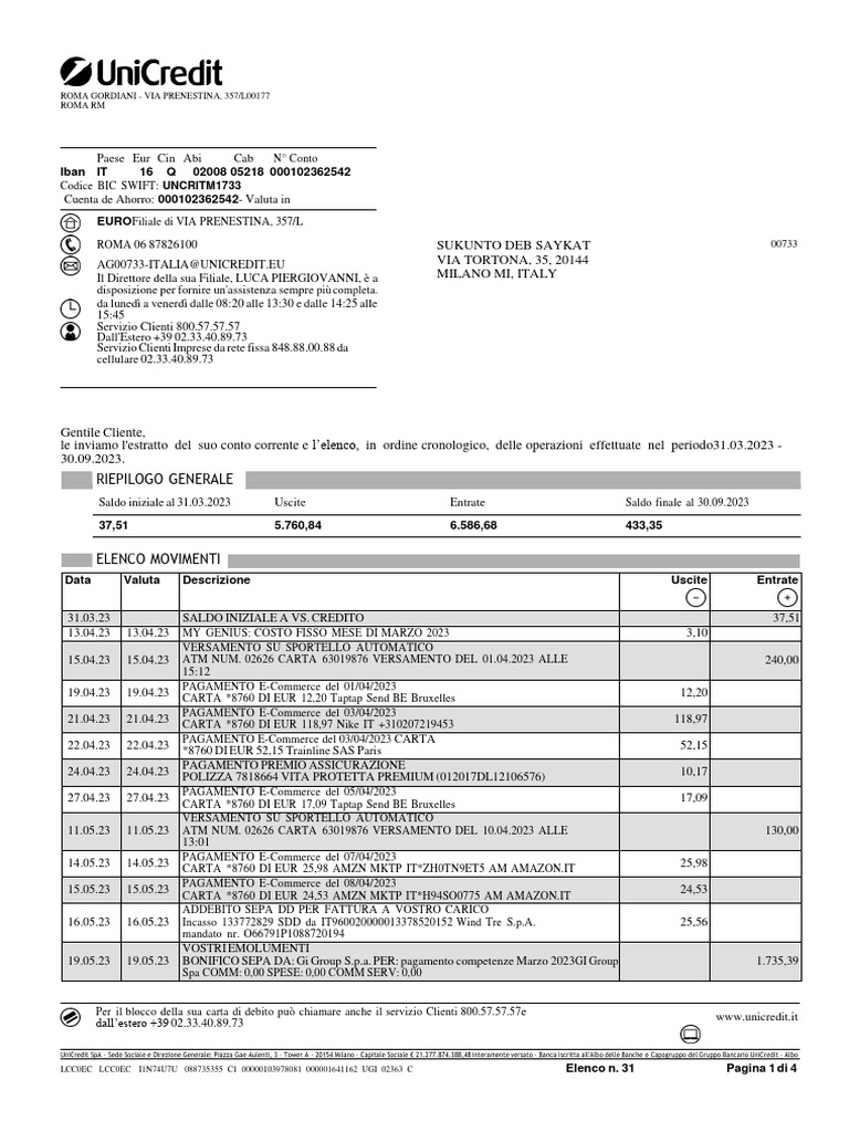 le inviamo l'estratto del suo conto corrente e l’elenco, in ordine cronologico, delle operazioni effettuate nel periodo31.03.2023 -