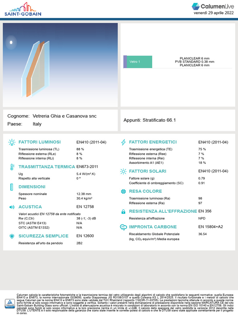 segue Calumen per le norme EN410 e EN673 sono state validate dal TÜV Rheinland (rapporto 11923R-11-33705). Le prestazioni tecniche ottenute in accordo a queste norme