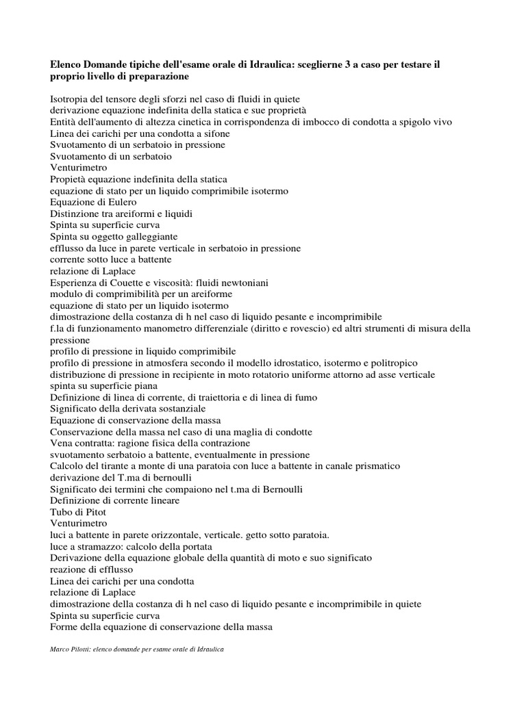 Marco Pilotti: elenco domande per esame orale di Idraulica
