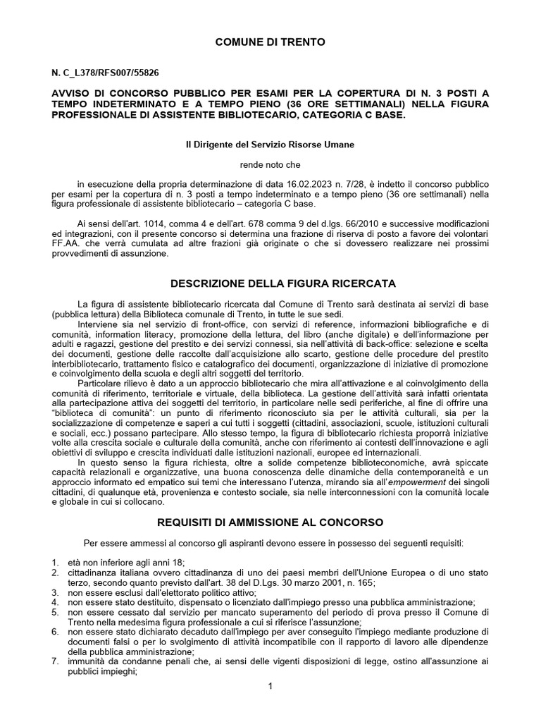 e a tempo pieno (36 ore settimanali) nella figura professionale di assistente bibliotecario – categoria C